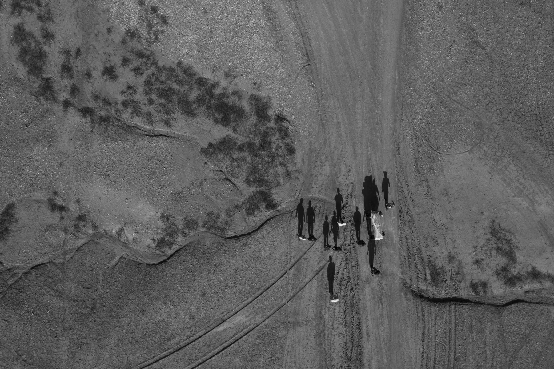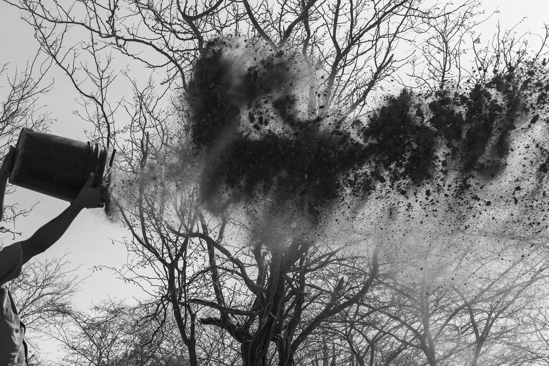And in the daytime the dark specter still lurks. In this part of the world the sun is particularly strong, and shadows are part of the natural landscape. In one image the strong sunlight casts long shadows across the landscape as figures form a funeral procession. The clustered group appear small in the vast landscape, with shadows much bigger than their forms stretched out behind them. In another shot, taken later in the funeral process, ashes are cast back into their landscape of heritage, floating on the wind. Beyond this ritual of respect, there is also a dialogue between the Wayúu and their ancestors long passed. In a clear night shot, the bright stars become symbolic of the Wayúu’s long lineage, as elders gaze up to their forebears.
