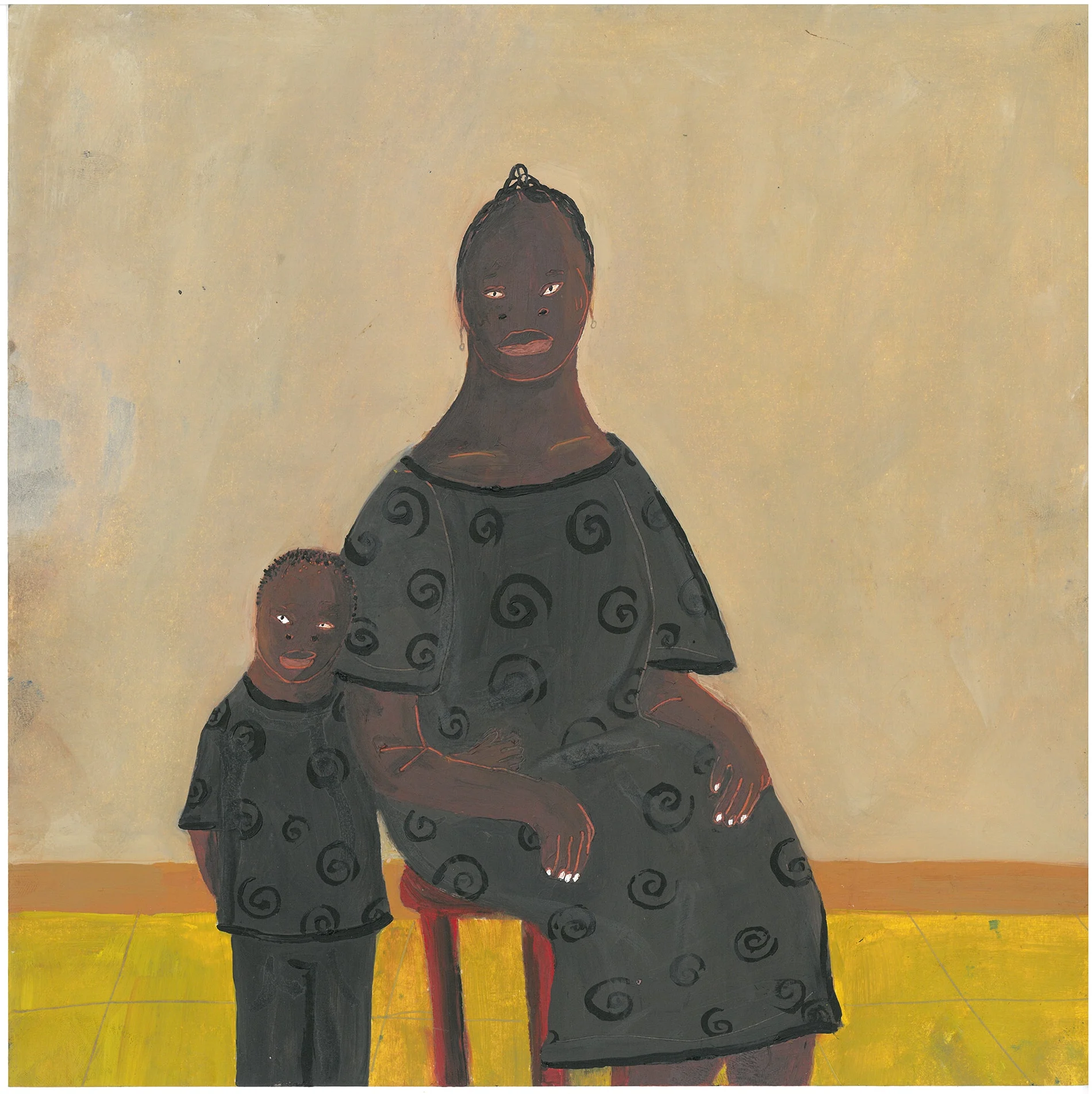 A schoolgirl and a Christian pastor stand side by side, glancing at each other. He is tall, and stands over her. She is slightly smaller, her face melancholic and naive. “The Priest & The School Girl” is one of Jemila Isa’s many scenes set in a Christian Nigerian space. The colors are flat and the proportions are unusual, giving the scene an innocent yet uncanny appearance. Isa grew up in London in a dual faith household—with a “hardcore” Christian mother and Islam from her father’s side—which allowed the young artist to be critical of both religions whilst maintaining reverence and admiration for them too.