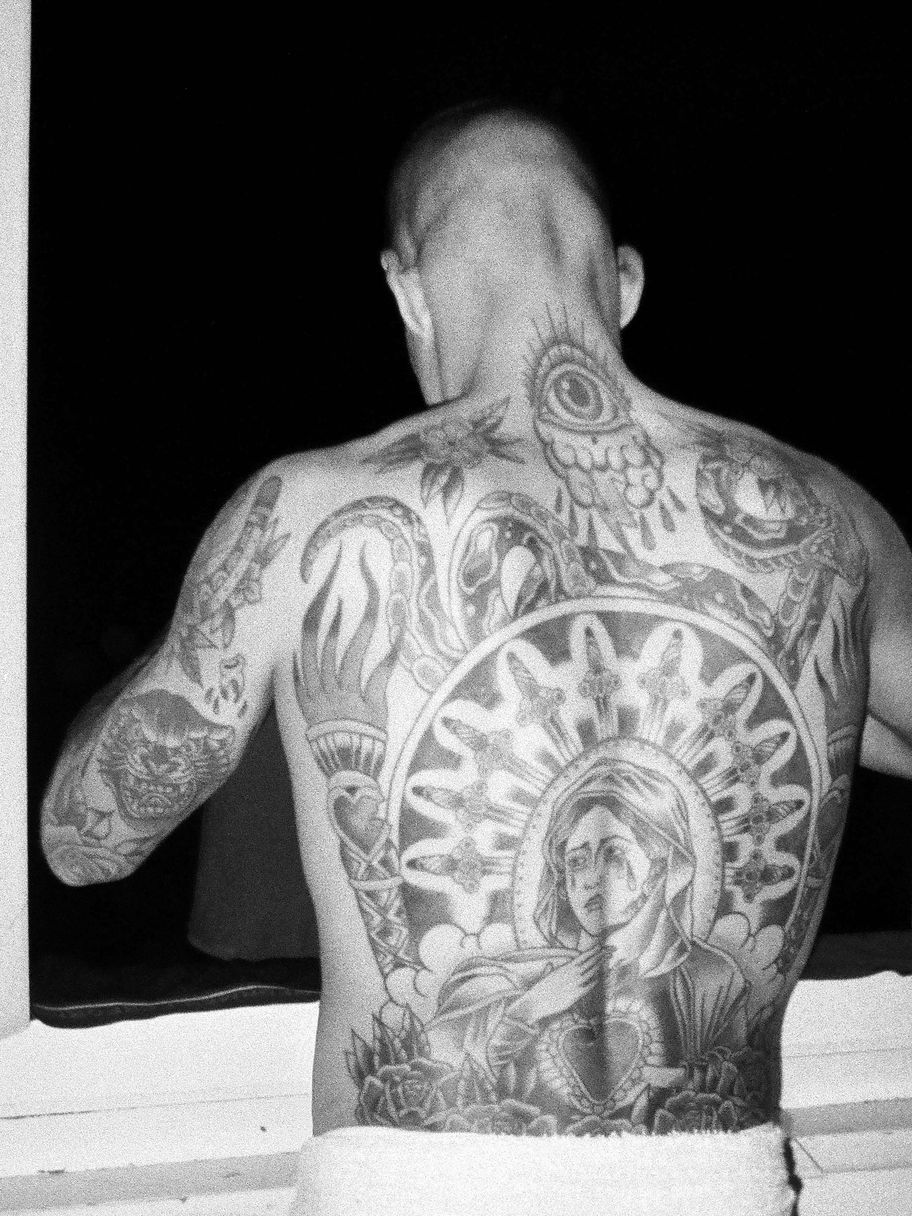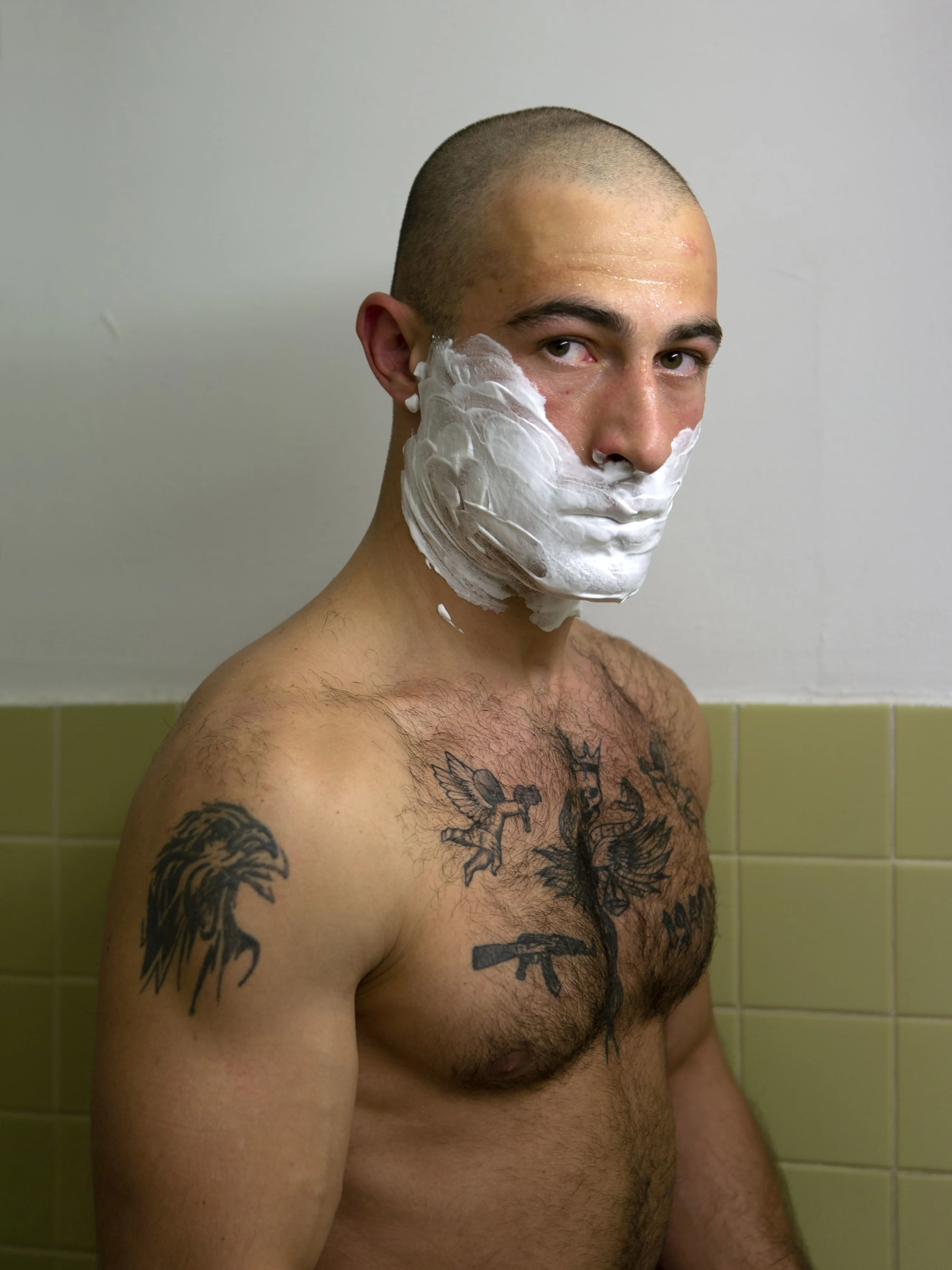 “Patria Nostra”—which means “our homeland”—continuously subverts the stereotype of a soldier and the hypermasculinity of militarized bodies with quiet moments of grace and intimacy. Her camera shifts between group scenes of drills to intimate moments singing together by the fire, capturing calm and committed scenes of brotherhood. We see a young man tenderly shaving his beard in front of a mirror, and two street sweepers working in unison as if performing choreography. In contrast, Joubert sought to find moments where she could distinguish the young men from each other, rejecting the Legion’s intention to dissolve the individual into the mass. Scars and tattoos evoke hidden experiences of their past life, enabling the portraits to hold two realities, past and present, simultaneously.
