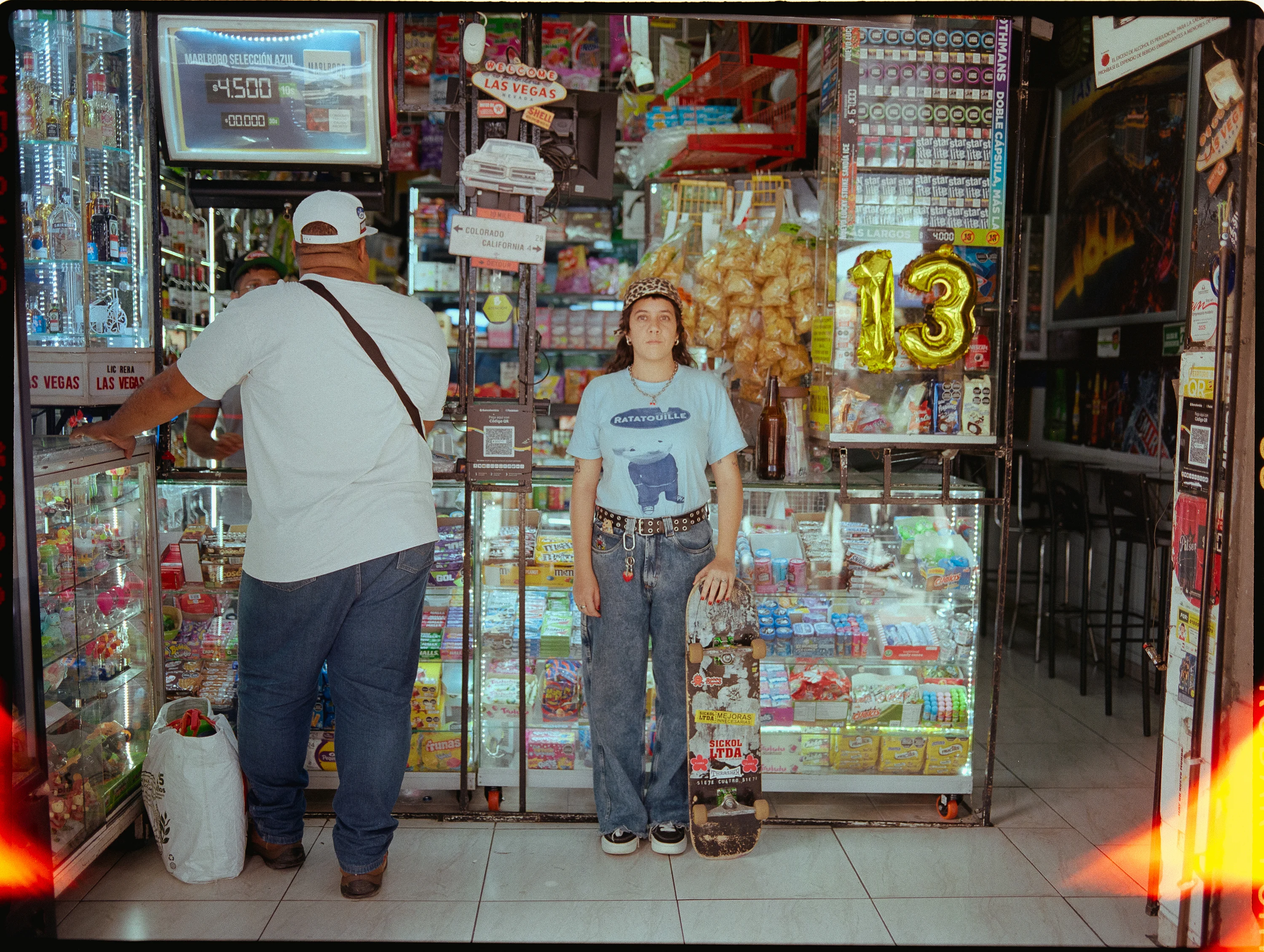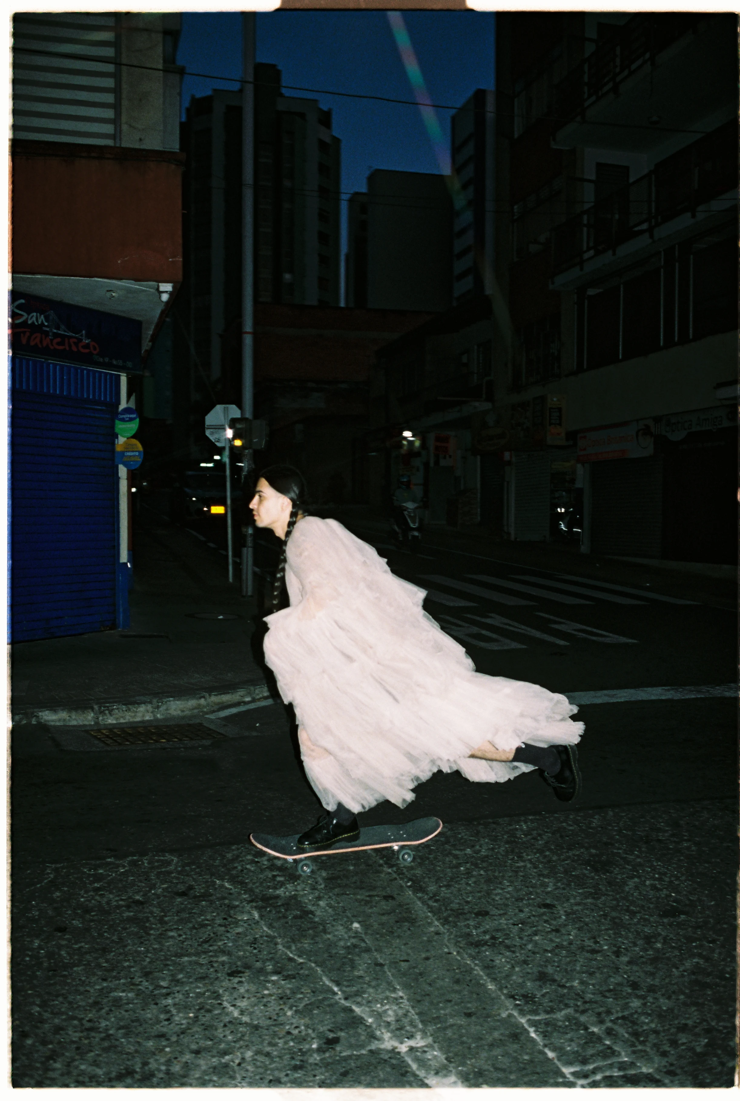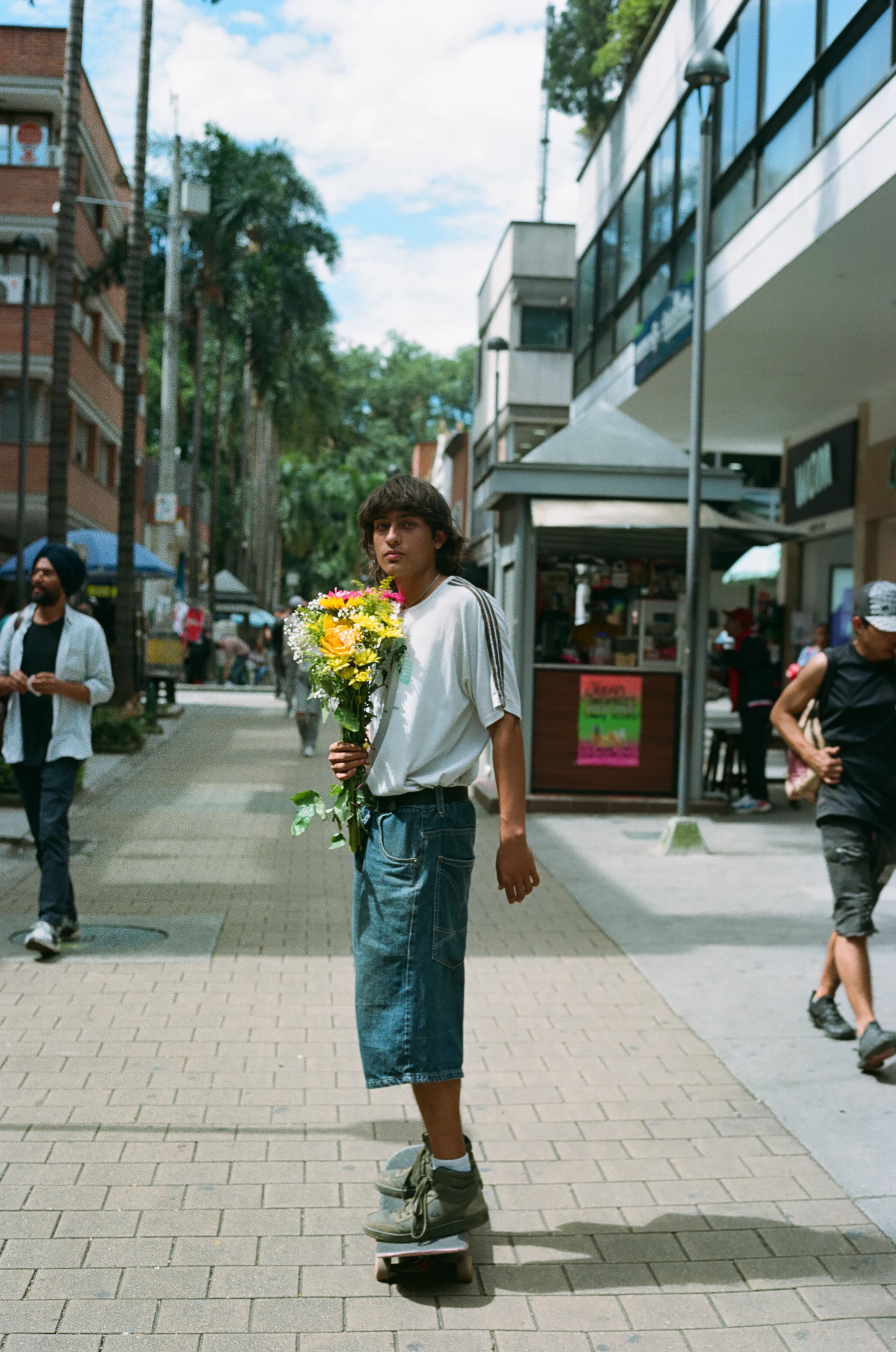 “It started as just one photo shoot, but then it really snowballed,” says Lauren. Once Ronnie told his skateboarding friends to meet them in the city for a shoot, those skaters invited their friends, who invited their friends, and soon they were traveling all over Medellín to capture everyone who wanted to be involved. Luxenberg shot skaters in cafés, carparks, churches, barrios, religious icon shops, florists and even while one of them worked a shift selling vegetables in the city center. “That one original shoot became eight days of shooting and filming in all different formats,” she says. The project takes us on a visual journey through the various barrios in Medellín. “We ended up creating a kind of unofficial guidebook for the city,” Ronnie says.