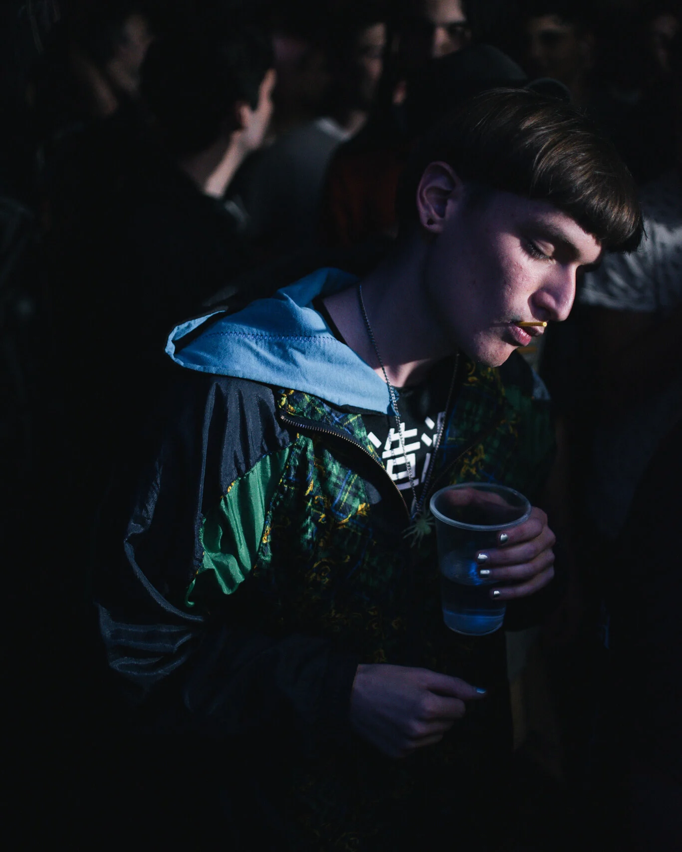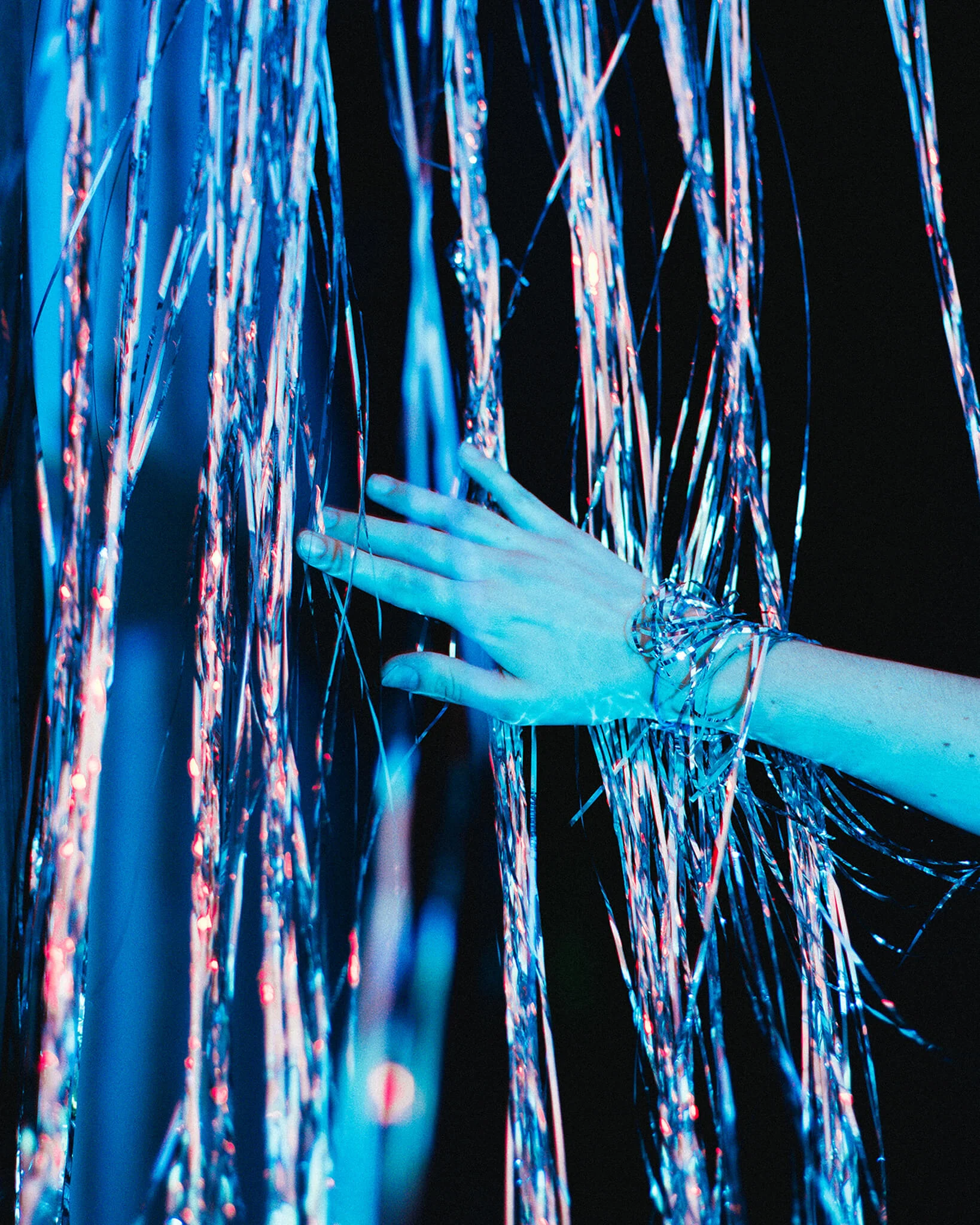 “For me, the dance floor is some kind of limbo, a place between life and death, because there we are in heaven,” Demichelis says. “I’m interested in creating ‘heavenly’ images in that space, in reflecting the inner trance people experience.” Demichelis’s imagery often takes on that “heavenly,” ecstatic quality through light: a young raver in a fluorescent harness and narrow sunglasses illuminated with moon-like glow, a fountain of sparkles in the night, a moment when time stopped on the dance floor, the crowd frozen like ghostly lilac shadows. There’s a sense of transparency as if we were looking at a rave happening in a snow globe—a dreamy ethereal effect achieved through remote flash and post-production, completely different to the usual nightlife image.