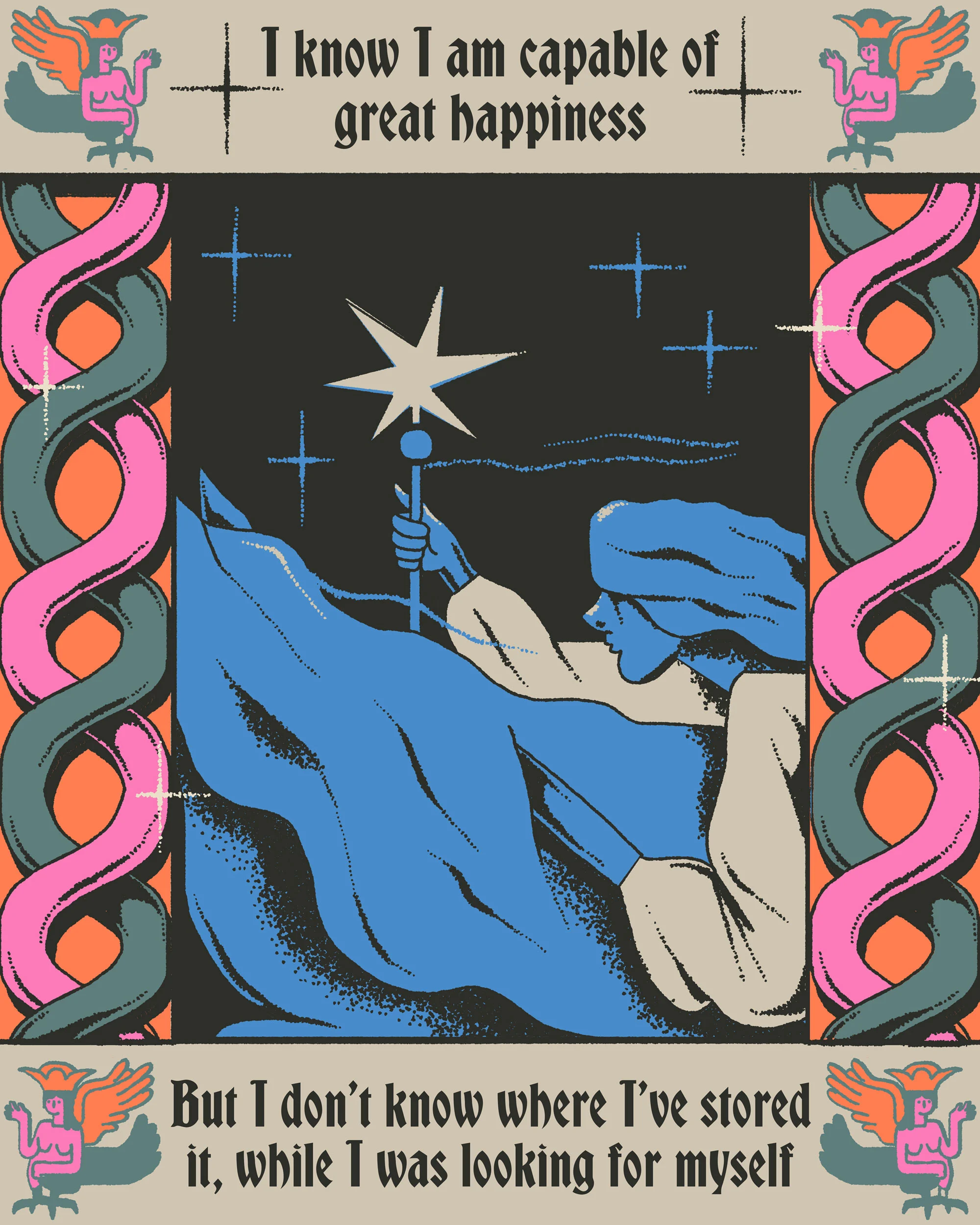 Later in life, Sașa found herself fascinated by Charles Burns' comic book X'ed Out, in which the dark, sensual feeling of the narrative relies equally on text and on a distinctive use of sharp lines and bold colours. Inspired by this, she began experimenting with her own hybrid of words and imagery and started to make digital sketches of whatever captured her attention. She likes how her choice of words will connect with people. “Being afraid of loneliness, I can't imagine not relying on words to communicate with others,” she confesses. “It’s liberating to find the right word for something that you think or feel.” Once Sașa does locate the perfect word, she conducts mental interviews with fonts as if they had personalities, finding the one matching the characters and the narrative she has in mind.