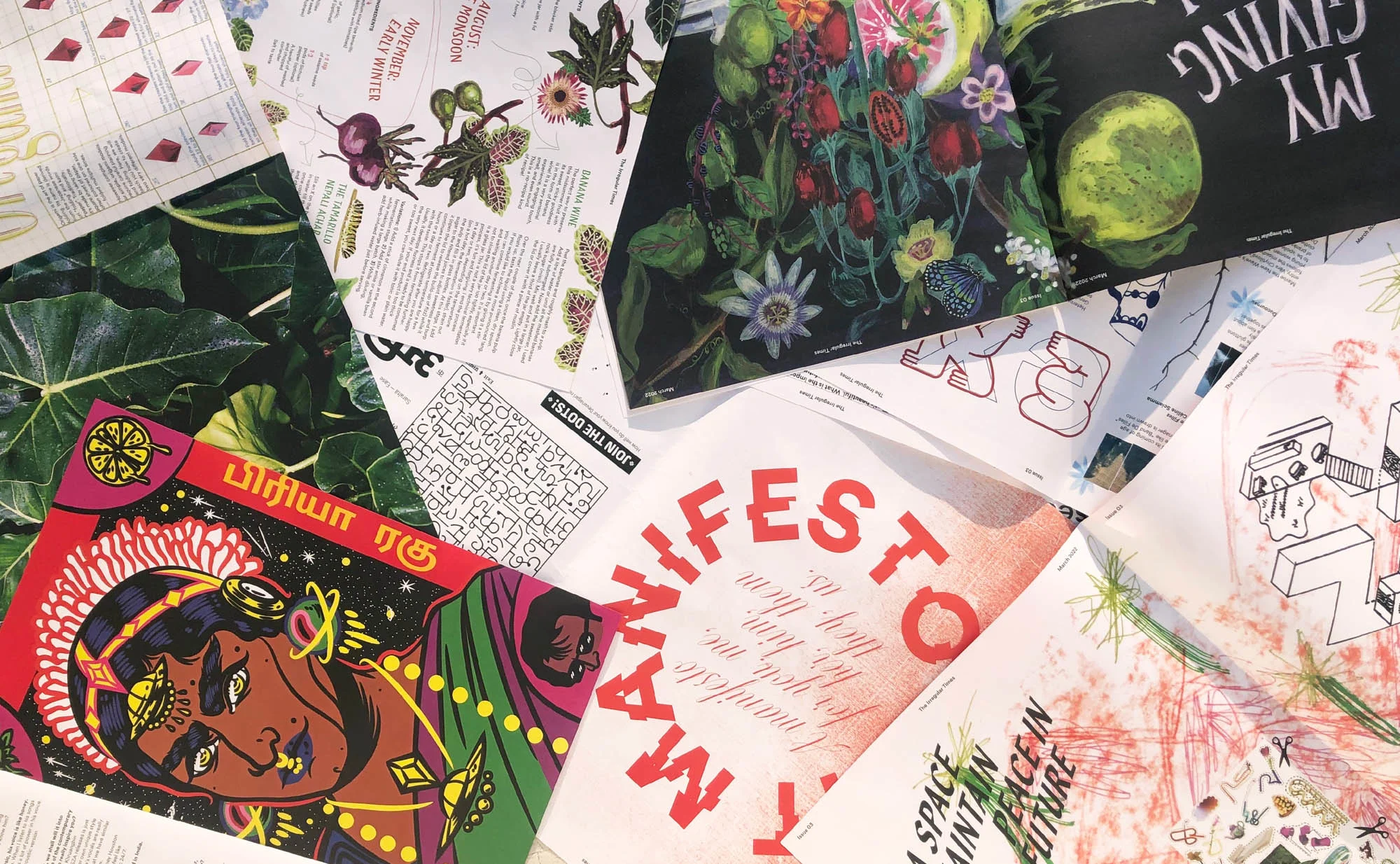 “We want people to cut out the art, frame it, make zines with it, create with it,” says Narayanan, describing how readers have made whole new artworks with The Irregular Times’s spreads in the past; winding, towering, paper-y sculptures and new publications in their own right. “We challenge the normative ways of printing: You have to turn the newspaper left and right and upside down to interact with it,” she says. All of this takes away the “preciousness” of a printed work, and turns the design into something functional, accessible, playful, physical, and unique. By engaging with form, that might inspire a reader to create their own new form.