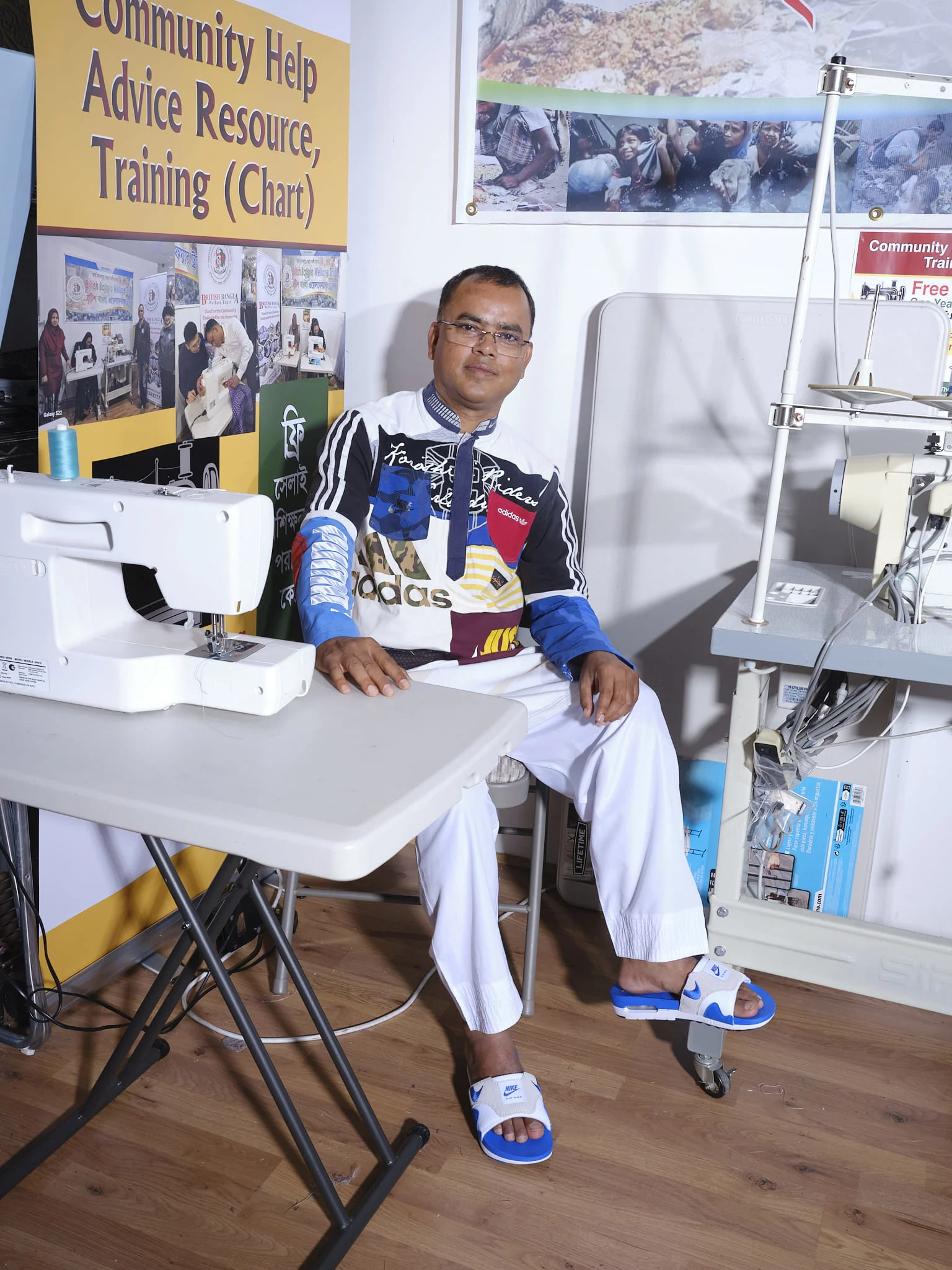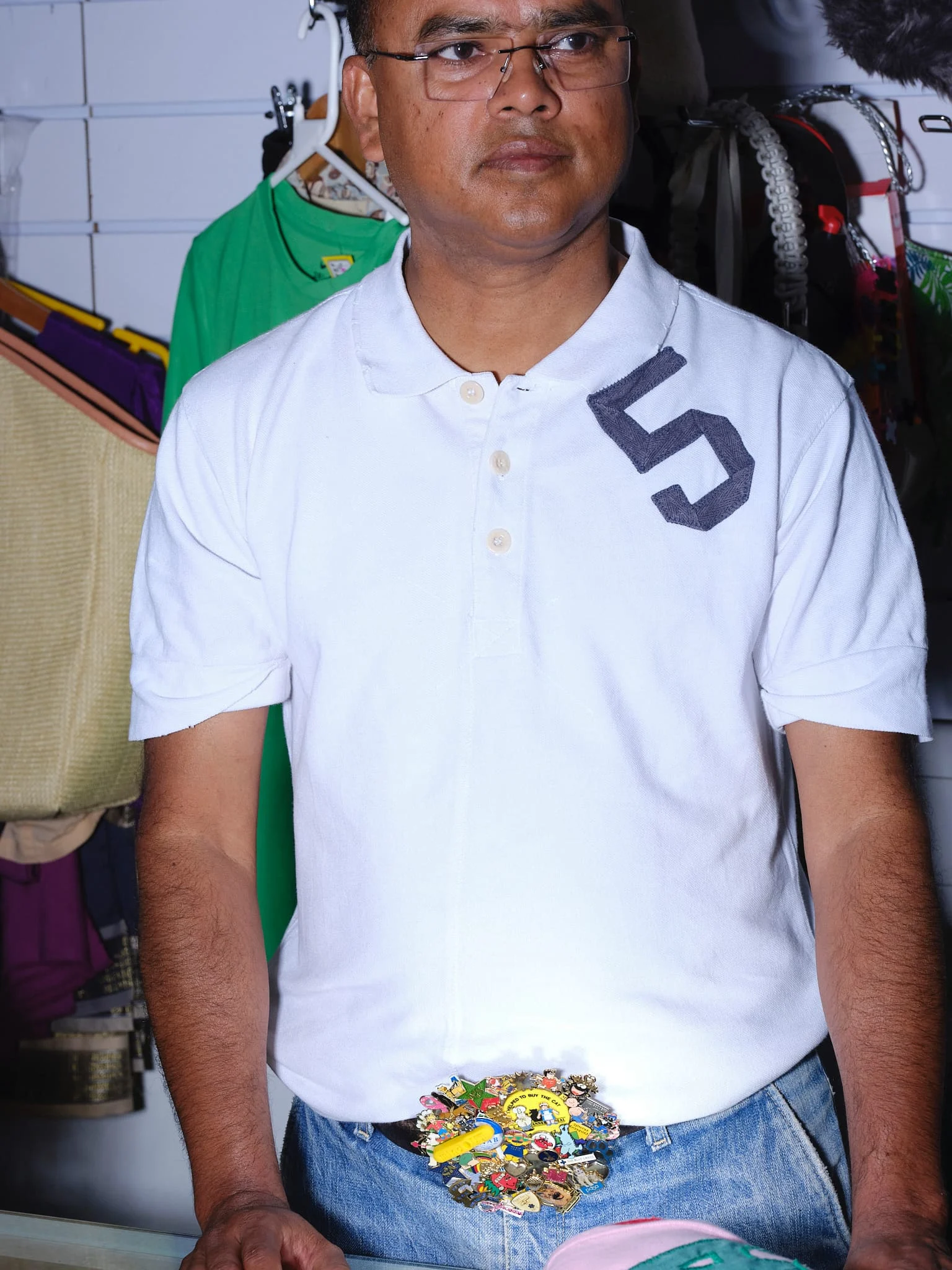 This comes through in the pair's most recent iteration for the series that stars Zaman, the founder of charity shop British Bangla Welfare Trust. The first outfit is a riff on how Bangladeshi men dress—smart upper wear, perhaps a polo tee and trousers, juxtaposed with casual flip flops. Only now, Khan styled the uncle in a shirt-kurta blend consciously repurposed from a range of vintage tees and jerseys from a bag of clothing the costume designer had donated to the charity shop. “To elevate it further, we got a cool pair of Nike Air Max sliders; it was SA but with a twist,” Khan explains.