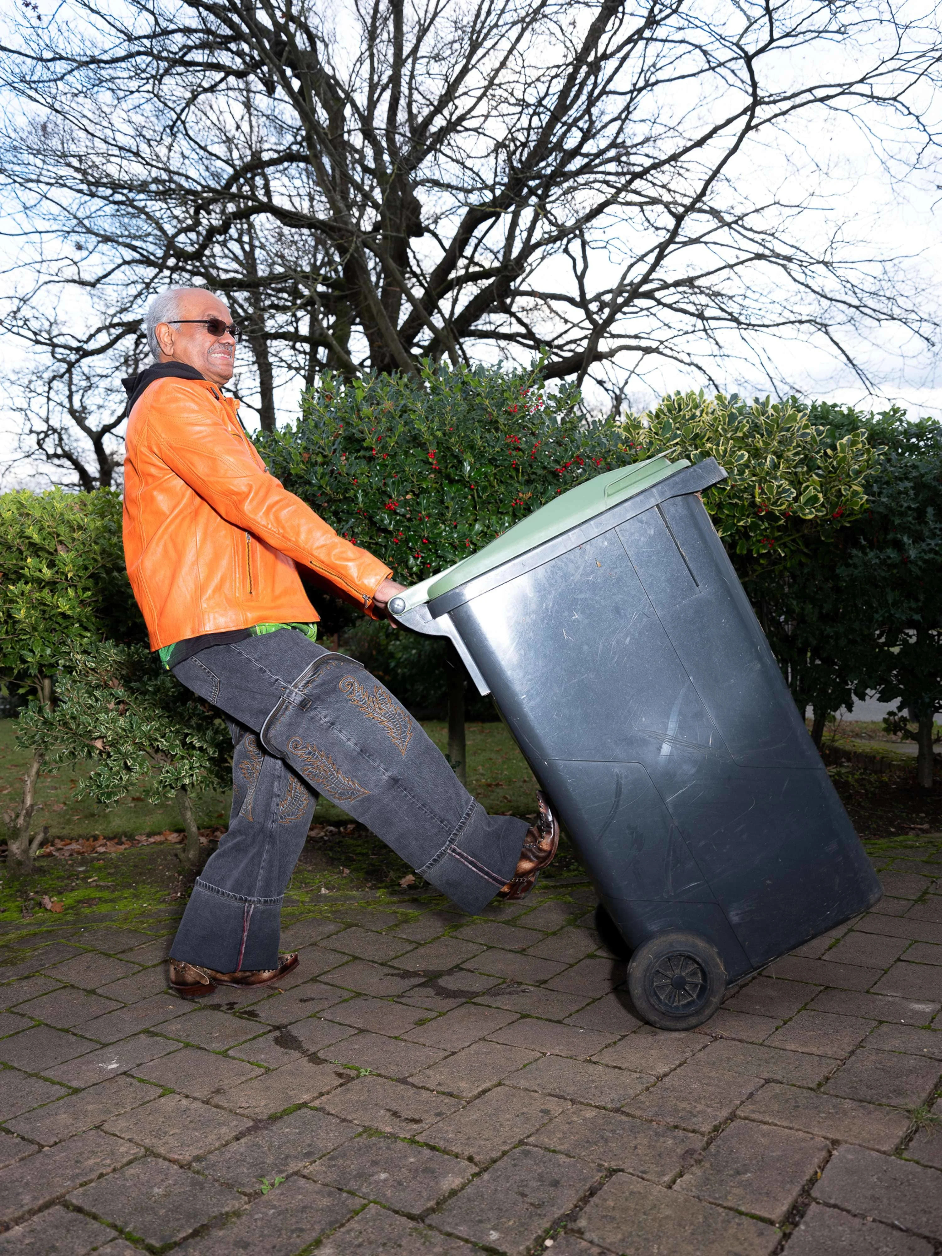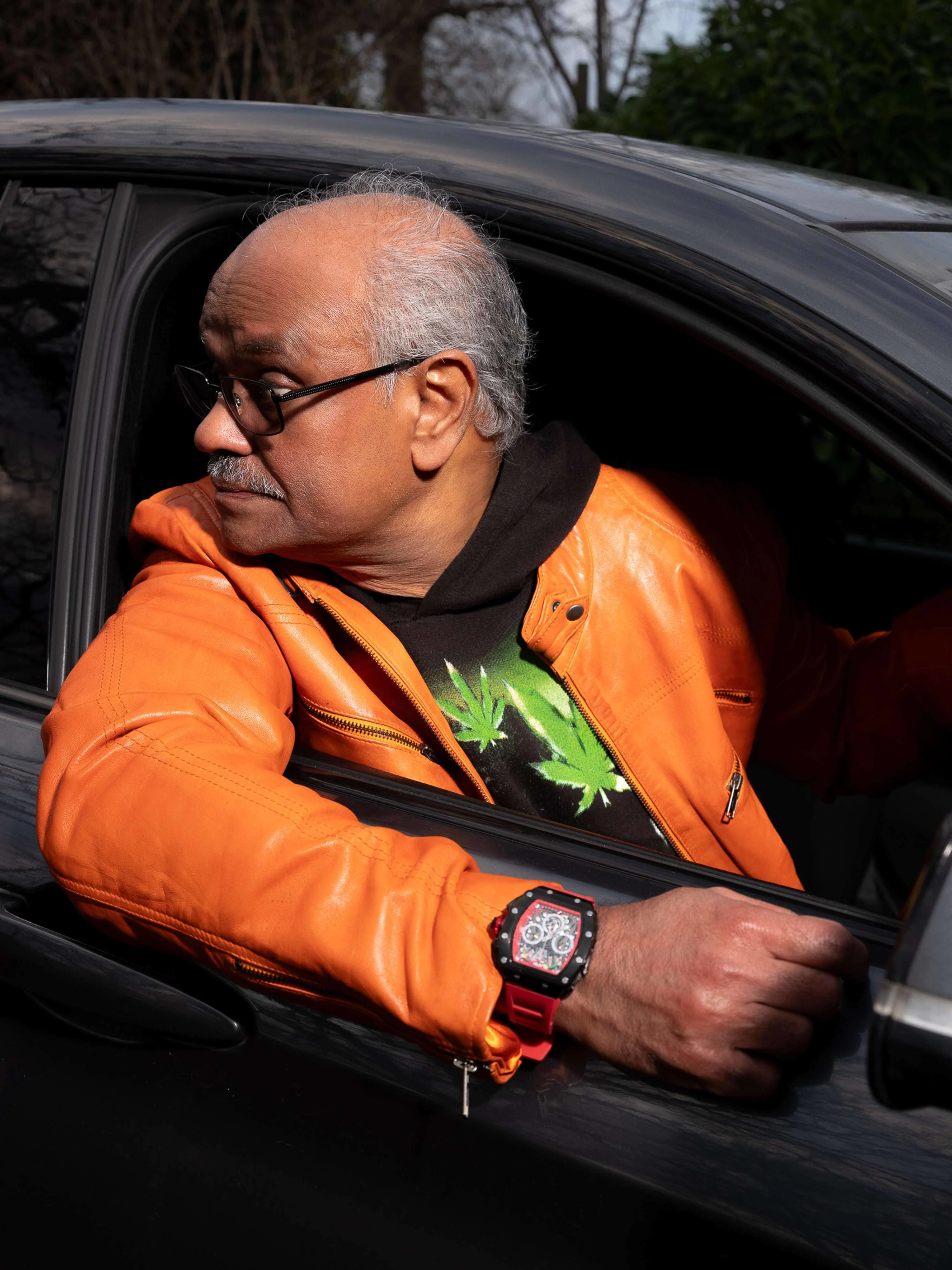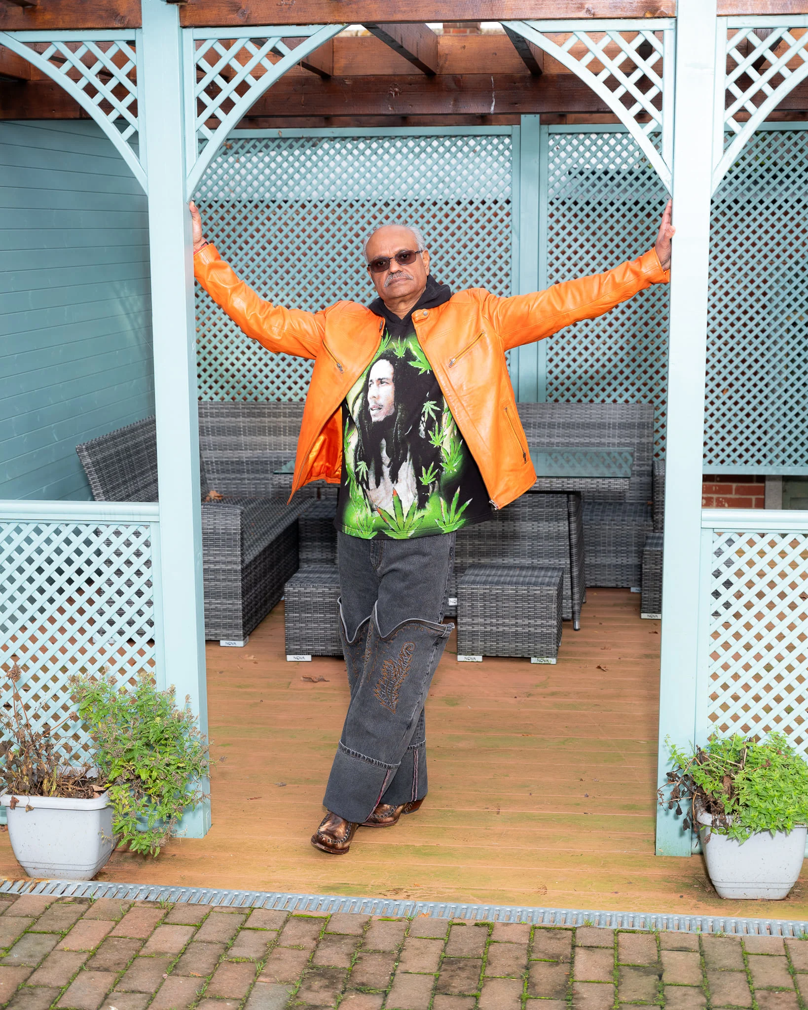 He describes the fit in question as a “more elevated version of what SA uncles in the West often wear: pointed shoes, denims and a leather jacket.” Except this time, the jacket was bright orange and layered over a Bob Marley hoodie with ganja leaves, while the pair of jeans were folded over at the hem to mimic cowboy boots. “I was just distraught because I knew that outfit was so empowering,” Khan says. It was at this point that Jordan Core, costume supervisor on the film and photographer by profession, suggested taking pictures of Murali styled in the outfit at his house instead. So in December 2023, the impassioned duo lugged the clothing and equipment an hour out to the suburbs of Chingford to shoot the uncle in his jazzed up costume.